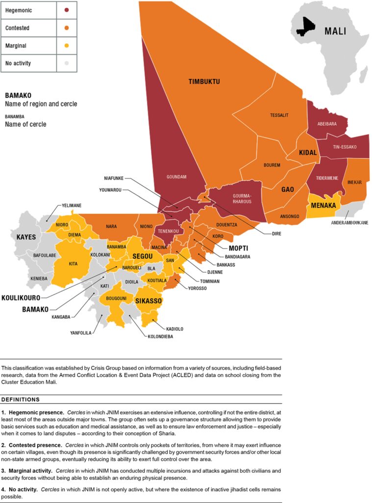 The report looks solely at Mali and only at options for talking to JNIM rather than other militants. It is in Mali where JNIM’s presence is largest and the fighting between it and government forces fiercest. Malian officials have also publicly acknowledged that they would consider dialogue with JNIM’s leadership. Though JNIM is active in Niger and Burkina Faso, its objectives in those countries are less clear than in Mali and prospects for talks with its leadership much slimmer.