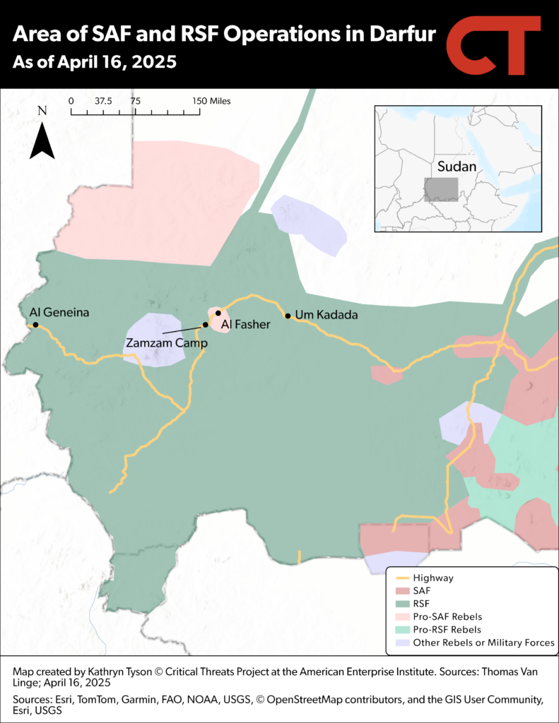 The Rapid Support Forces (RSF) has intensified their offensive against the Sudanese Armed Forces (SAF) in western Sudan since losing Khartoum in March in order to consolidate control there and establish a de facto partition. The RSF attacked the Zamzam Refugee Camp—nine miles south of the North Darfur state capital al Fasher—on April 9 and captured the camp after days of fighting on April 13.[1] The last SAF military stronghold in the Darfur region is in al Fasher, and the RSF has besieged the state capital since April 2024.[2] The RSF has staged 400 vehicles at the Zamzam camp and is reportedly mobilizing more forces near al Fasher.[3]
