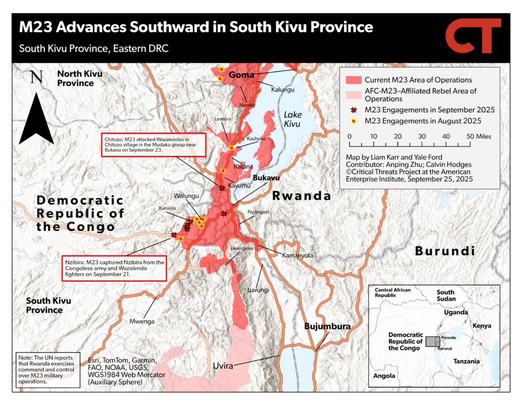Author: Yale Ford with Liam KarrRwandan-backed M23 rebels captured a key town near the Walungu district capital in South Kivu from the Congolese army (FARDC). M23 captured Nzibira from the FARDC and pro-Congolese government Wazalendo fighters who undertook a “strategic retreat” on September 21.[i] Nzibira is an important tin and gold mining town and FARDC logistics hub with an airfield about 20 miles southwest of Walungu town in South Kivu in the eastern Democratic Republic of the Congo (DRC).[ii] M23 had launched an offensive near Walungu town in early August and captured several villages before advancing southward and westward toward Nzibira on two axes despite resistance from pro-Congolese government militias in late August and early September.[iii]