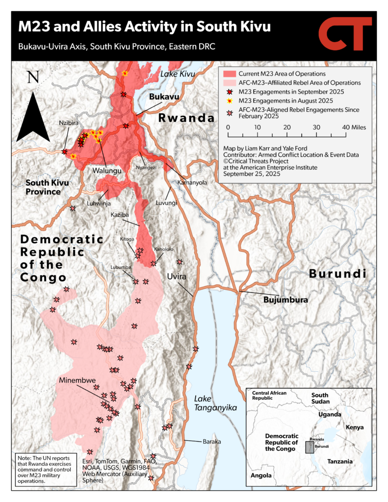 - Democratic Republic of the Congo (DRC). Rwandan-backed M23 rebels are conducting at least two separate offensives in North and South Kivu, which likely violates the Qatari-brokered ceasefire between M23 and the DRC and could further complicate already-struggling peace talks. M23 is likely attempting to set conditions to attack two strategic towns—Uvira in South Kivu and Pinga in North Kivu—by targeting key positions along several axes toward both targets.