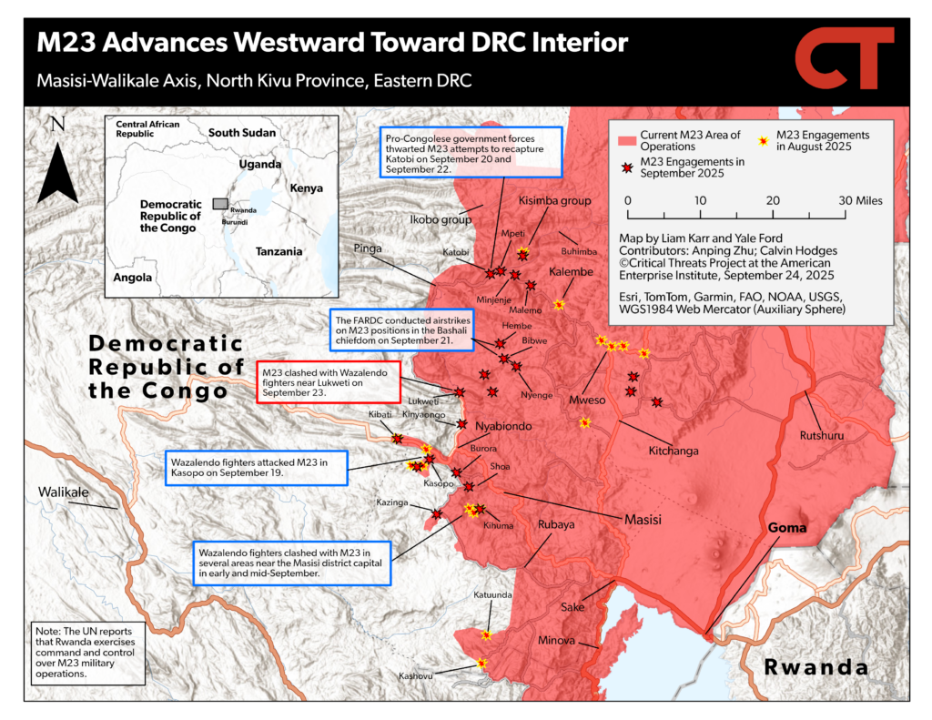 M23 launched a separate offensive in north-central Masisi district in North Kivu. M23 has captured several villages in the Bashali chiefdom in north-central Masisi, roughly 15 miles southeast of Pinga since early September.[xv] Wazalendo fighters and hundreds of civilians in Bashali have fled toward Pinga from Lukweti village, which sits on a local road 25 miles south of Pinga and 10 miles north of Nyabiondo.[xvi]