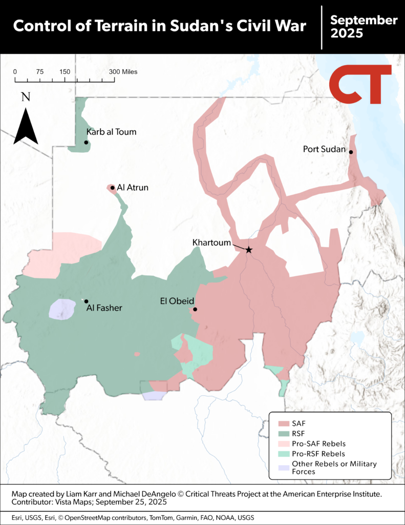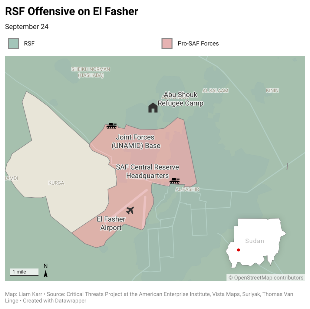 CTP has previously assessed that the RSF aims to capture el Fasher imminently to strengthen its position in Sudan-related discussions at the now-ongoing UN General Assembly and US-backed peace talks in late September.[lxxi] The RSF has tried to do so by conducting frequent and indiscriminate artillery and drone strikes to weaken SAF-aligned forces’ positions.[lxxii] The group then carries out ground operations to break SAF defensive lines. The RSF is deploying electronic jamming and other antiaircraft tools to counter SAF air capabilities.[lxxiii] This process has allowed the RSF to gradually advance from the east, north, and south to tighten the siege. The city’s Coordination of Resistance Committees—a coalition of civil society groups—stated on September 21 that the RSF will overwhelm defenses without an “immediate” operation from SAF-aligned forces to break the siege.[lxxiv]