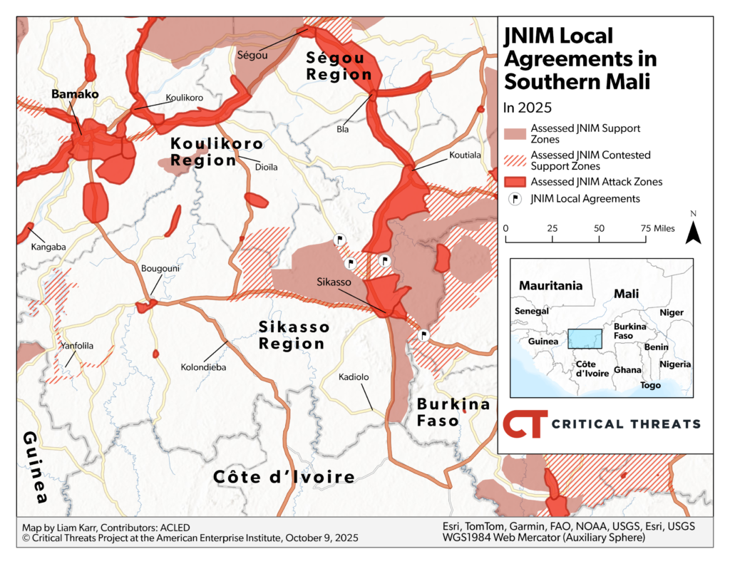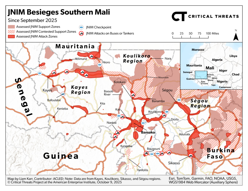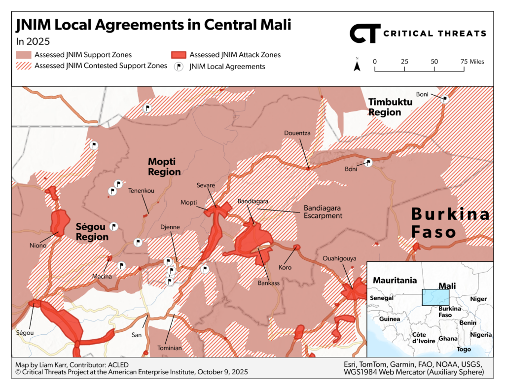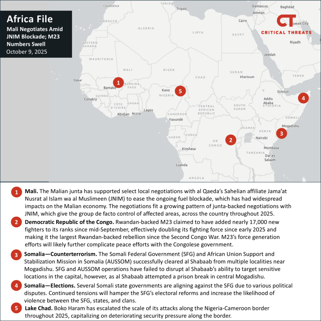 Mali. The Malian junta has supported select local negotiations with al Qaeda’s Sahelian affiliate Jama’at Nusrat al Islam wa al Muslimeen (JNIM) to ease the ongoing fuel blockade, which has had widespread impacts on the Malian economy. The negotiations fit a growing pattern of junta-backed negotiations with JNIM, which give the group de facto control of affected areas, across the country throughout 2025.