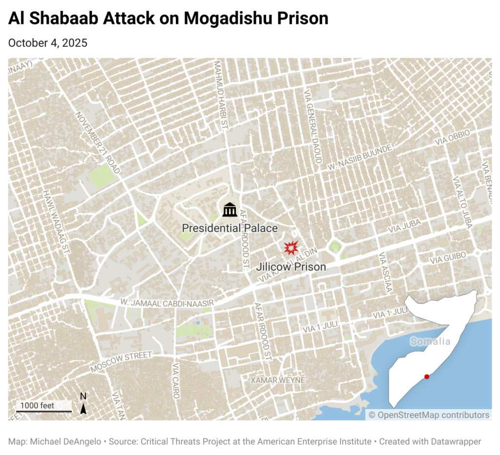 The prison attack in a sensitive location undermines the SFG’s message that it is degrading al Shabaab’s capabilities.[lxiii] Prime Minister Hamza Abdi Barre held an event on the streets of Mogadishu emphasizing the capital’s safety earlier on October 4.[lxiv] Barre announced that the SFG would reopen 52 roads in Mogadishu to allow for normal commercial activity and traffic flows.[lxv] Barre cited the improved security situation as the reason to open the roads, which the SFG had closed for 15 years.[lxvi] Somalia’s Ministry of Internal Security has mandated that SFG forces inspect military vehicles moving through Mogadishu in the wake of the prison attack.[lxvii] Al Shabaab had not conducted a notable attack in central Mogadishu since it attempted to assassinate President Hassan Sheikh Mohamud in March 2025, with no major attacks on military sites since October 2024.[lxviii]