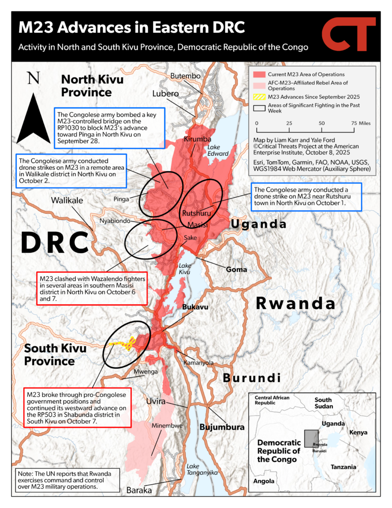 Democratic Republic of the Congo. Rwandan-backed M23 claimed to have added nearly 17,000 new fighters to its ranks since mid-September, effectively doubling its fighting force since early 2025 and making it the largest Rwandan-backed rebellion since the Second Congo War. M23’s force generation efforts will likely further complicate peace efforts with the Congolese government.