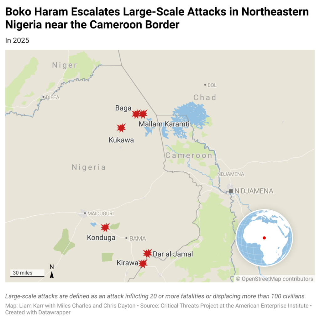 The Kirawa attack follows a series of large-scale Boko Haram attacks along the Nigeria-Cameroon border in 2025. Several of these attacks were retaliatory, likely to coerce local populations into working with the group. Boko Haram massacred 100 civilians that it accused of spying for Islamic State—West Africa Province in northern Nigeria, along the border, in early 2025.[lxxxvii] The group killed another 60 civilians that it accused of collaborating with the Nigerian military in Dar Jamal—a village 10 miles from Kirawa—in September.[lxxxviii] Boko Haram has launched six large-scale attacks in 2025—defined as an attack inflicting 20 or more fatalities or displacing more than 100 civilians—compared to one in 2024.[lxxxix]