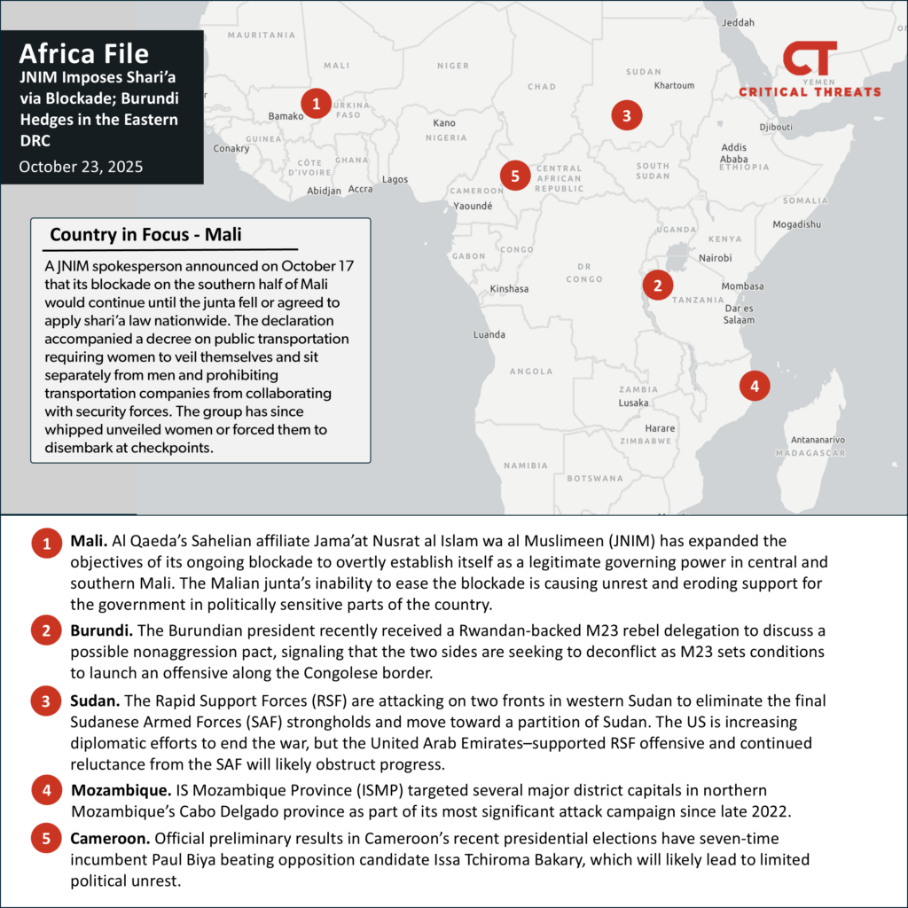 - Burundi. The Burundian president recently received a Rwandan-backed M23 rebel delegation to discuss a possible nonaggression pact, signaling that the two sides are seeking to deconflict as M23 sets conditions to launch an offensive along the Congolese border. Burundi deconflicted with Rwanda in the eastern Democratic Republic of the Congo in early 2025 and is likely trying to do so again to avoid a wider regional war.