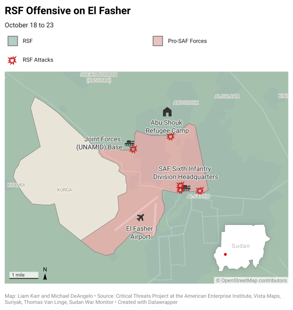 The Rapid Support Forces (RSF) captured a Sudanese Armed Forces (SAF)-aligned forces headquarters and advanced to the outskirts of the SAF headquarters, which are two of three key locations in el Fasher—the capital of North Darfur region. The RSF advanced from the north to take control of the SAF-aligned militia Joint Forces headquarters at the former United Nations–African Union Mission in Darfur (UNAMID) base on October 18, giving the RSF control over northwest el Fasher.[37] The RSF had already controlled part of the base since late September.[38] The RSF also attacked the SAF Sixth Infantry Command headquarters in central el Fasher. The RSF made a brief incursion into the base for the first time before the SAF reportedly repelled them on October 19.[39] The RSF launched another attack on the base and the nearby Darfur governor’s compound on October 23.[40] The RSF claimed to have captured the governor’s compound, but the SAF claimed to have repelled the attack.[41]
