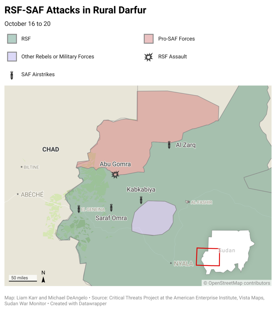 The RSF are simultaneously assaulting a SAF-aligned pocket along key ground lines of communication that connect North Darfur to the RSF’s rear support zone in Chad. The RSF captured Abu Gomra—located 200 miles northwest of el Fasher—on October 16, advancing from Kabkabiya, which is 60 miles to the south.[48] The Joint Forces retook the town on October 17.[49] The RSF has reportedly organized forces in Kabkabiya, al Zarq, and Saraf Omra to recapture Abu Gomra, potentially including personnel and equipment redeployed from el Fasher.[50] A local source also reported that the RSF has closed the Kabkabiya to Abu Gomra section of a road leading to the Chadian border.[51] The SAF conducted airstrikes in Kabkabiya, al Zarq, and Saraf Omra on October 19 and 20.[52] The RSF and SAF had mobilized forces in North and West Darfur since late September.[53]