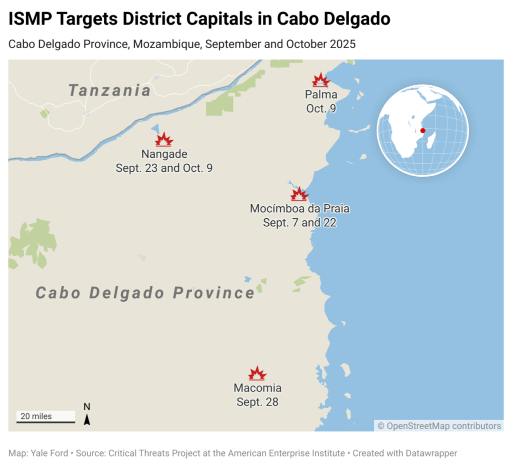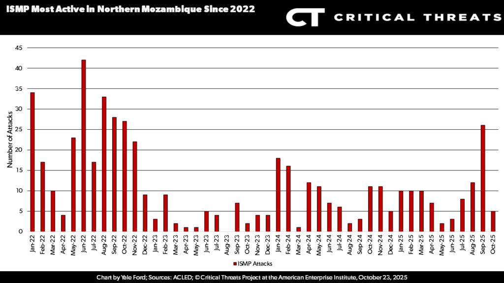 IS Mozambique Province (ISMP) targeted several major district capitals in attacks in northern Mozambique’s Cabo Delgado province as part of its most significant attack campaign since late 2022. ISMP attacked and killed civilians in two separate raids on Mocímboa da Praia town on September 7 and September 22.[79] The attacks in Mocímboa da Praia marked ISMP’s first attacks in the town since August 2024 and its most significant incursion since 2020–21, when it controlled the town.[80] ISMP insurgents attacked civilians in Macomia town on September 28 in the group’s first major attack there since May 2024.[81] The group conducted raids on Nangade town on September 23 and October 9, marking its first attack on Nangade since July 2022.[82] ISMP attacked civilians on the outskirts of Palma town on October 9, following an uptick in ISMP activity in the surrounding district since September, for the first time since January 2025.[83]