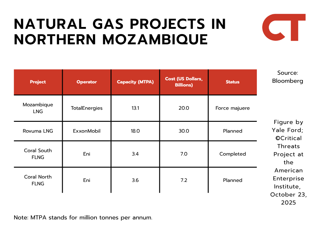 ISMP’s campaign may be tied loosely to efforts to resume Western- and US-backed natural gas projects in Cabo Delgado. ISMP’s mid-2025 campaign has corresponded with the recent push to resume two of Cabo Delgado’s four major liquefied natural gas (LNG) projects, which American and Western investors suspended due to the insurgency.[97] US-based ExxonMobil and the French hydrocarbon company TotalEnergies are both financing LNG projects on the Afungi peninsula in in Palma district in the Rovuma deepwater basin. ExxonMobil had delayed the final investment decision on its site in Afungi in late 2024 from 2025 to 2026 due to the security situation in Cabo Delgado.[98] The ISMP insurgency previously forced Total to declare force majeure on its $20 billion project in April 2021 and shelve plans to restart the project in early 2024.[99] The Total CEO said in September that the project is slated to restart construction soon, and the company is reportedly expected to lift its declaration of force majeure in the coming weeks.[100]