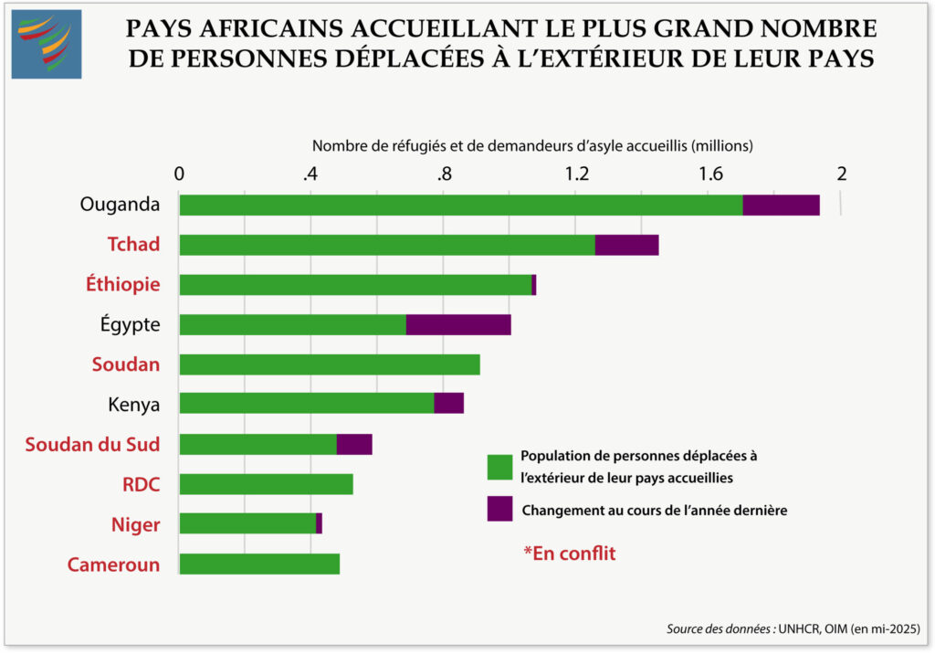 Cette année, le nombre de réfugiés et de demandeurs d’asile accueillis dans un autre pays africain a augmenté de 13 %, soit 11,44 millions de personnes, ce qui souligne les implications intrarégionales de ces flux de population persistants.