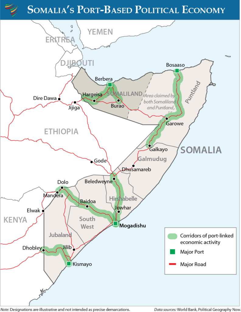 Following several false starts, Somalia’s parliament adopted a provisional constitution in 2012 that laid the foundation for a parliamentary, federal republic. According to the Provisional Constitution, the Council of Ministers, chaired by the Prime Minister, is designated as “the highest executive authority of the Federal Government,” with the President serving in an essentially ceremonial role.5 The Provisional Constitution stipulates two levels of authority: the Federal Government (FGS) and Federal Member States (FMS). Not coincidentally, the three most powerful States—Somaliland, Puntland, and Jubaland—administer the port economies of Berbera, Bosaaso, and Kismayo, respectively. The fourth port, Mogadishu, sustains both the local Banaadir administration and the FGS itself, which controls 85 percent of Mogadishu’s port revenues.