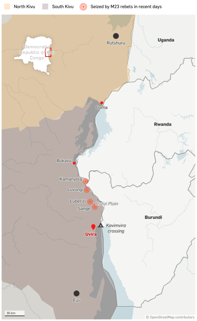 In recent days, the rebels have seized Kamanyola, Luvungi, Sange and Luberizi, pushing to within operational distance of Uvira, the government’s last major foothold in South Kivu after Bukavu’s fall in February.