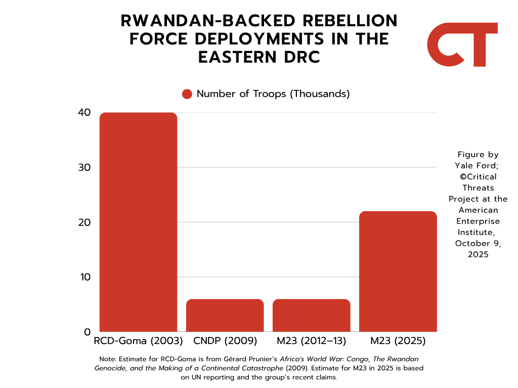 Note: The estimate for RCD-Goma is from Gérard Prunier, Africa’s World War: Congo, the Rwandan Genocide, and the Making of a Continental Catastrophe (Oxford University Press, 2009). The estimate for M23 in 2025 is based on UN reporting and the group’s recent claims.