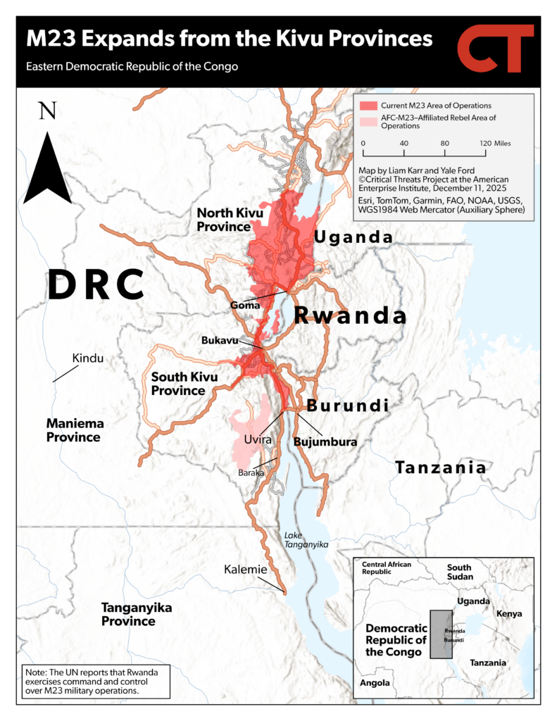 M23’s capture of Uvira is Burundi’s gravest national security threat in years. Burundi and Rwanda are rivals in the eastern DRC, and both view their competition as potentially existential. The Burundian foreign ministry denounced attacks on Burundian territory during the fighting and Rwanda’s “belligerent attitude” on December 8.[xlvii] Rwanda has accused Burundi of “sabotaging the peace process” and condemned it for the “systematic bombing” of villages on the Rwandan side of the border.[xlviii] Senior M23 officials said that the group does not have territorial claims on Burundi on December 9.[xlix] The Burundian foreign minister still said that “what threatens Uvira also threatens Bujumbura” and that “all options are on the table” for a response on December 10.[l]