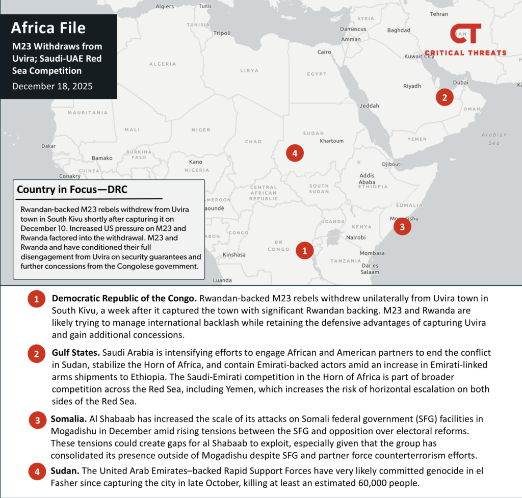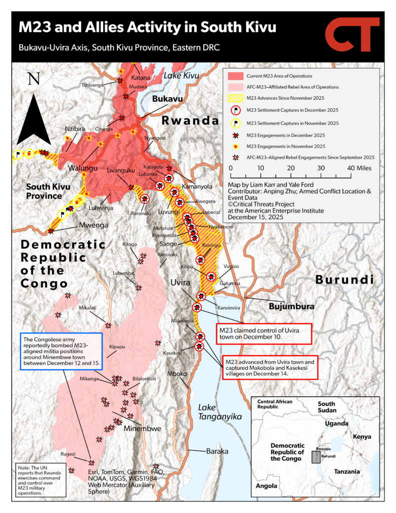 Democratic Republic of the Congo. Rwandan-backed M23 rebels withdrew unilaterally from Uvira town in South Kivu, a week after it captured the town with significant Rwandan backing. M23 and Rwanda are likely trying to manage international backlash while retaining the defensive advantages of capturing Uvira and gain additional concessions.