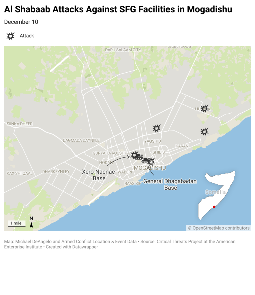 Al Shabaab has escalated the scale of its attacks on Somali federal government (SFG) facilities in Mogadishu, the Somali capital, in December. The group carried out suicide bombings on two separate military bases in Mogadishu on December 10. Somali forces shot a suicide bomber outside the General Dhagabadan base, causing their vest to detonate.[96] Al Shabaab claimed that the attack killed 23 soldiers, while the SFG stated that there were only injuries.[97] Another fighter detonated a suicide vehicle-borne improvised explosive device (SVBIED) at the Xero Nacnac base.[98] Al Shabaab claimed that the attack killed 18 soldiers, while the SFG and Somali media reported that seven soldiers died.[99]