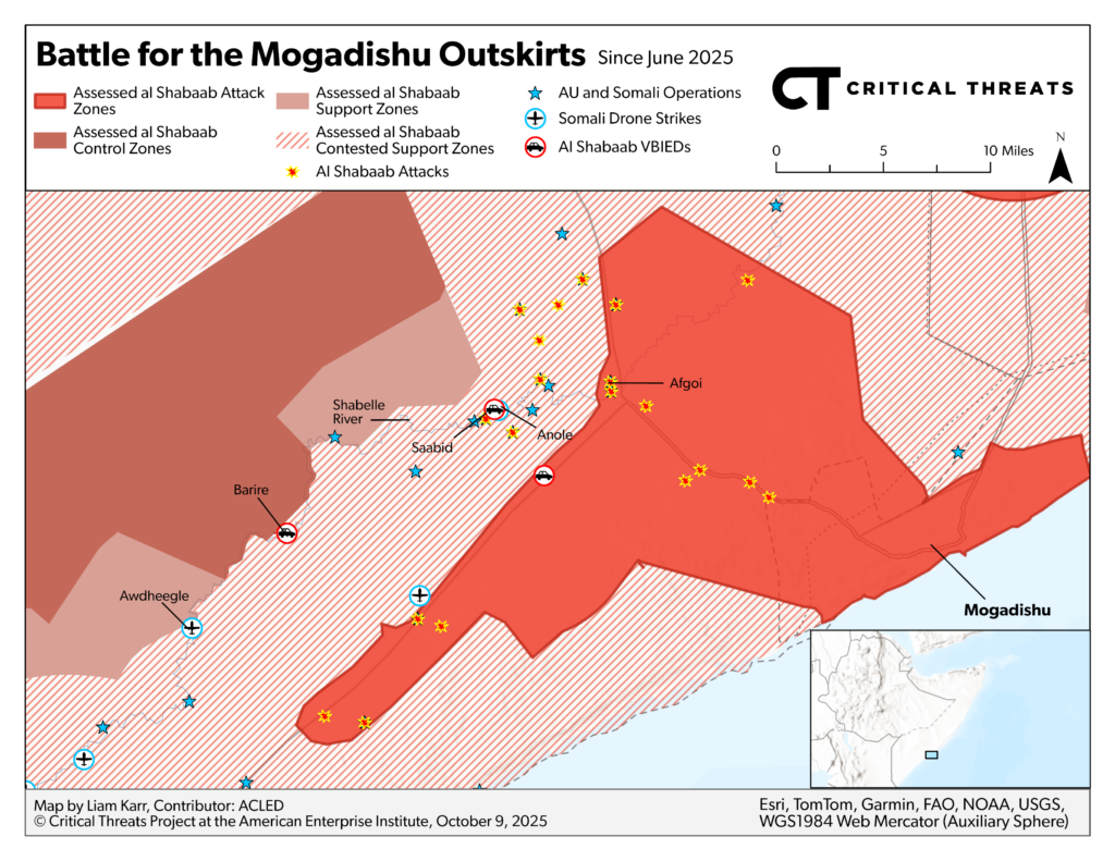 Al Shabaab has consolidated rear support zones outside of Mogadishu despite earlier SFG and African Union Support and Stabilization Mission in Somalia (AUSSOM) gains in the lower Shabelle River valley in 2025. SFG and AUSSOM forces conducted an offensive from June to October to regain control of key towns linking al Shabaab-controlled areas of the Shabelle River valley in southern Somalia to Afgoi, a district capital located on the outskirts of Mogadishu.[113] SFG and AUSSOM forces captured Awdheegle, Barire, and Sabiid, key towns southwest of Afgoi that served as forward operating bases for al Shabaab to cross the Shabelle River and pressure Mogadishu.[114]