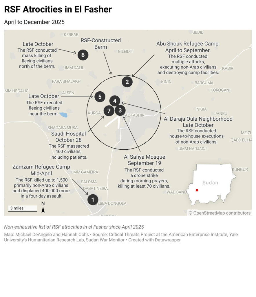 The United Arab Emirates–backed Rapid Support Forces (RSF) have very likely committed genocide in el Fasher, Sudan since capturing the city in late October. The United Nations defines genocide as “acts committed with intent to destroy, in whole or in part, a national, ethnic, racial, or religious group.”[120] The RSF systematically targeted non-Arab civilians, prioritizing operations in non-Arab neighborhoods and conducting house-to-house mass killings.[121] Sudan War Monitor reported that the RSF prevented non-Arab RSF-aligned fighters from participating in these operations.[122] 52 of 150 potential body clusters are located in Daraja Oula neighborhood, the primary neighborhood that sheltered non-Arab civilians, according to satellite Yale University’s Humanitarian Research Lab’s satellite imagery analysis.[123] The RSF has continued disposing of bodies in mass graves located across el Fasher, including in Daraja Oula.[124] Up to 150,000 of the 250,000 heavily non-Arab population living in el Fasher before the RSF’s takeover remained unaccounted for as of early December.[125] A UK Parliament briefing reported out a conservative estimate that the RSF had killed 60,000 people in el Fasher by late November.[126]