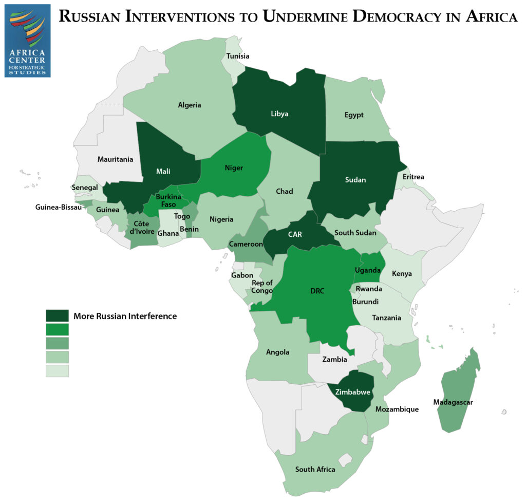 Russia remains the leading external supporter of Africa’s military juntas whose extraconstitutional seizures of power have been a key entry point through which Russia has expanded its influence. Russia also maintains a strong presence in the Central African Republic, where Russian operatives are heavily involved in securing a third term for President Faustin-Archange Touadéra. This is consistent with a broader pattern of Russian efforts to undermine democracy in Africa as a means of strengthening Moscow’s influence on the continent.