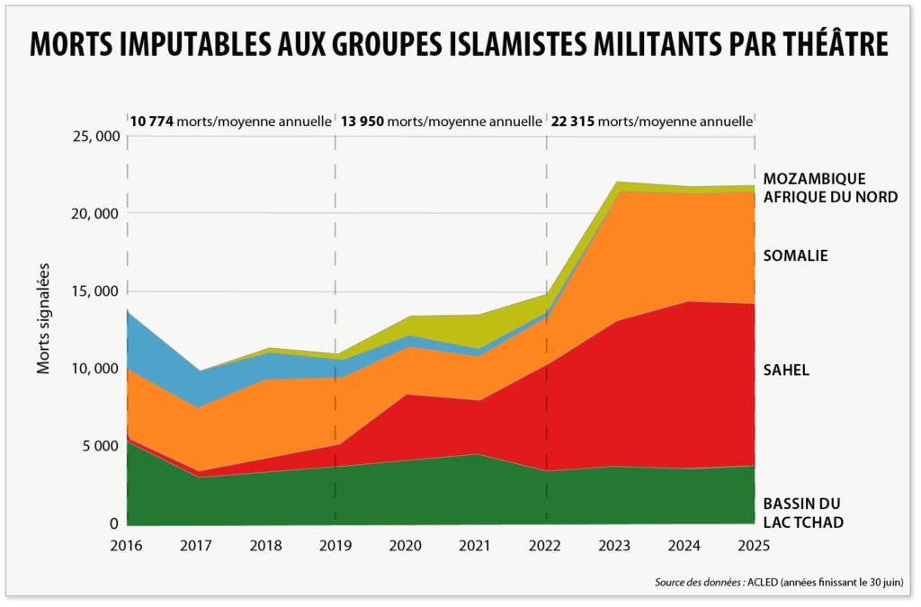 The 22,307 deaths linked to militant Islamist groups in Africa over the past year maintain a record level of lethality observed since 2023 and represent a 60% increase over the 2020-2022 period.