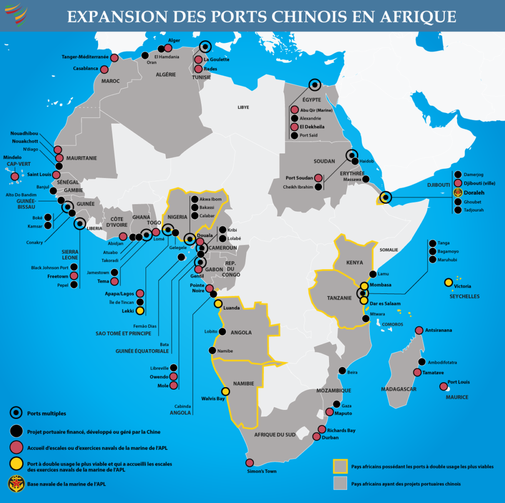 Les entreprises publiques chinoises sont des acteurs actifs dans environ 78 ports situés dans 32 pays africains, en tant que constructeurs, financiers ou exploitants. Les entreprises chinoises sont présentes dans plus d’un tiers des pôles maritimes commerciaux africains, ce qui représente une présence nettement plus importante que partout ailleurs dans le monde. Le développement expansif des ports chinois permet à la Chine de réaffecter des ports commerciaux à des activités militaires.