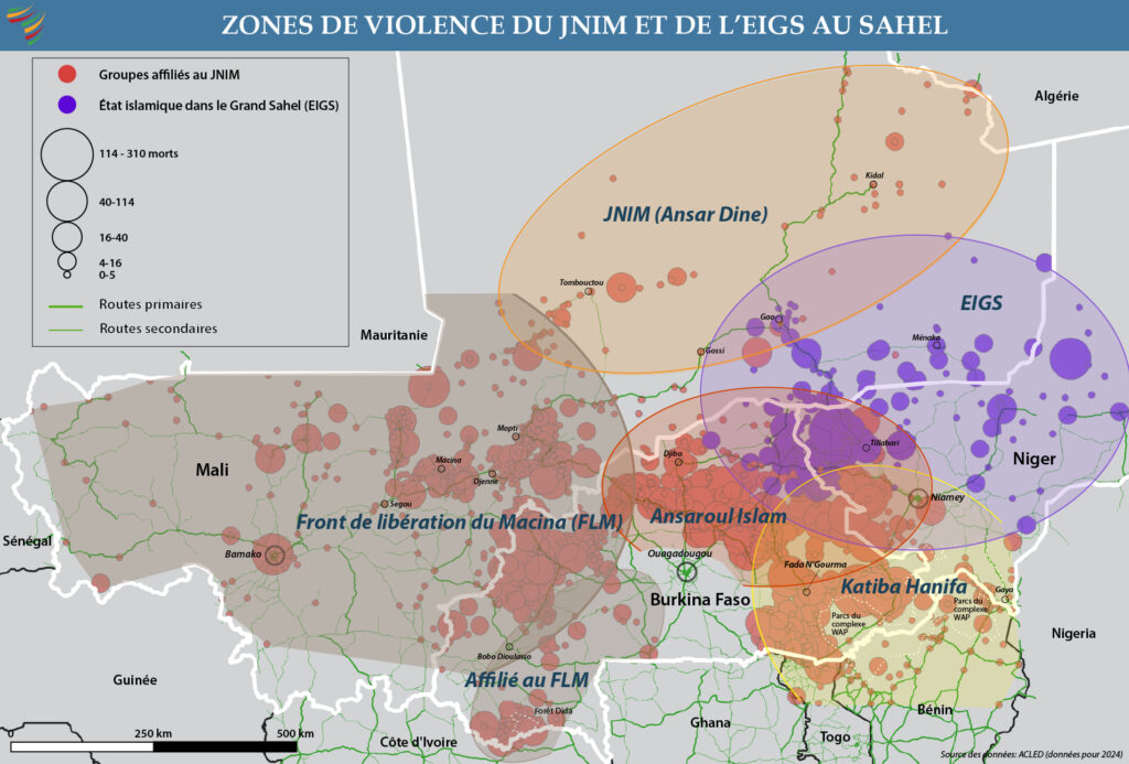 Le Sahel est considéré depuis quatre années consécutives comme le théâtre le plus meurtrier de la violence des islamistes militants en Afrique, représentant 55 % de toutes les morts liées aux groupes islamistes militants. On estime que 67 % de tous les non-combattants tués par des groupes islamistes militants en Afrique se trouvent au Sahel.