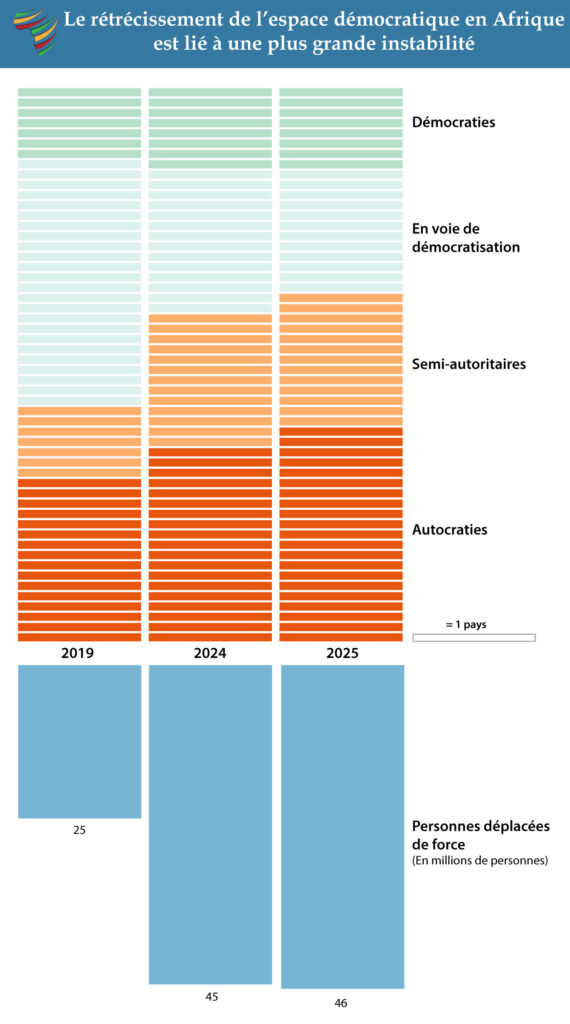 Dans le prolongement de cette tendance, 14 des 15 pays africains qui comptent le plus grand nombre de personnes déplacées de force ont des gouvernements à tendance autoritaire, ce qui souligne les répercussions régionales d’une gouvernance non représentative.