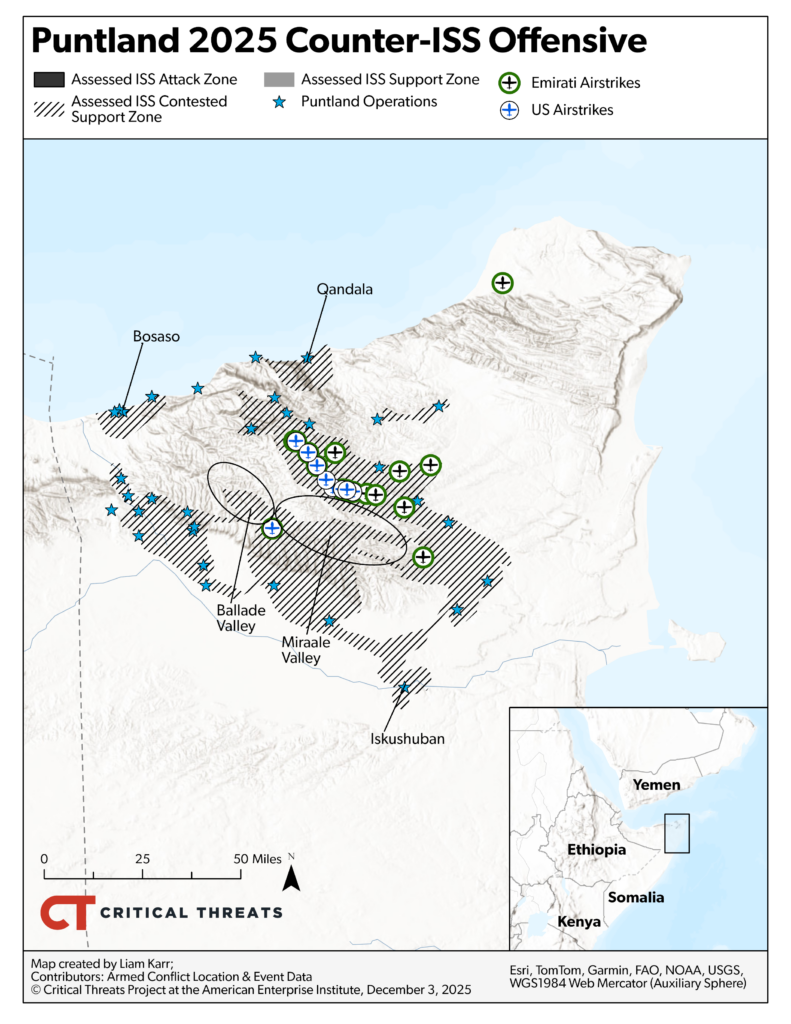 The UAE has also been involved in Puntland’s offensive against the Islamic State in Somalia (ISS), which has severely degraded but not defeated the group since 2024. Puntland has credited UAE air support, which has included airstrikes, as playing an important role in the campaign.[32] The UAE-supported Puntland Maritime Police Force has conducted operations against ISS.[33] Puntland has reportedly contained ISS to several valleys in the Cal Miskaad mountains, relegating remaining ISS fighters to moving in small groups to evade Puntland forces.[34] ISS has reemerged in previously cleared areas, however, and its core leaders remain at large.[35]
