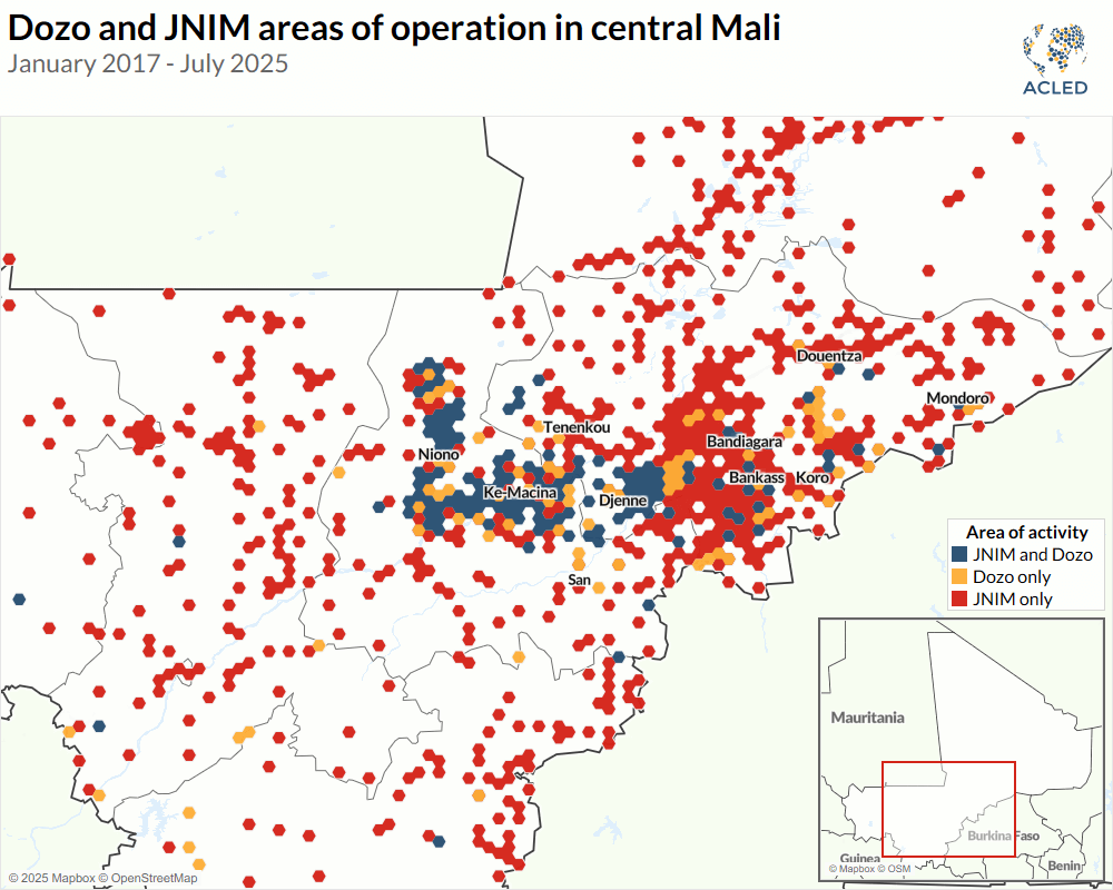 - JNIM, a jihadist group, has paradoxically become the most effective force in disarming and weakening other non-state armed groups, including the pro-government Dozo militias. Through a combination of coercion, informal agreements, and strategic messaging, JNIM has persuaded or pressured communities to expel or demobilize pro-government self-defense groups in exchange for protection and access to livelihoods. This dynamic illustrates not only the failure of state-led stabilization but also the growing strength and influence of JNIM as the dominant armed actor in large parts of central Mali.