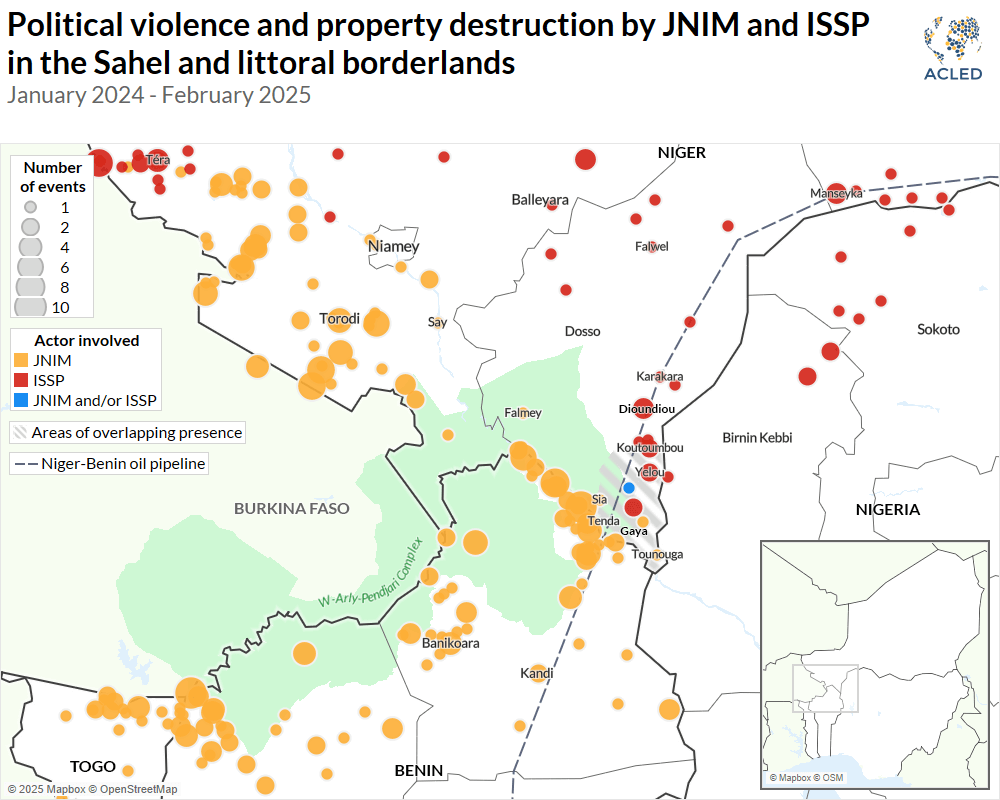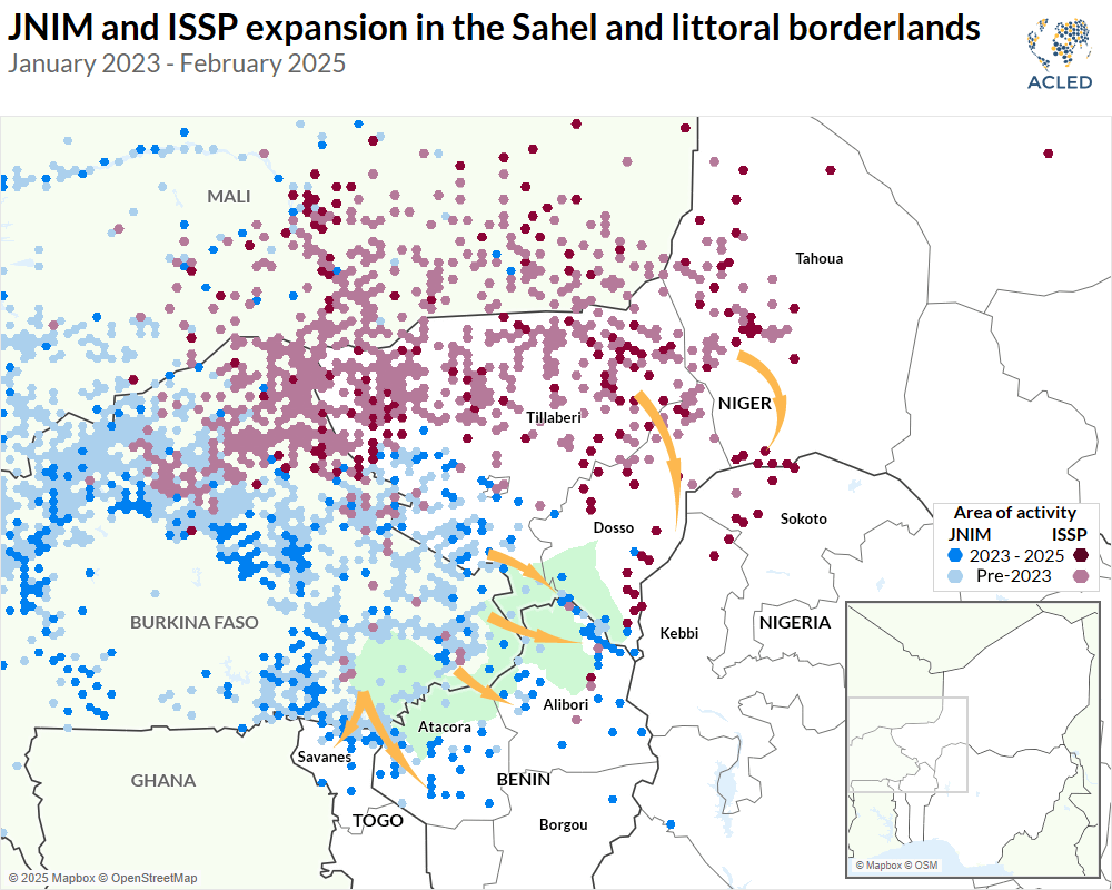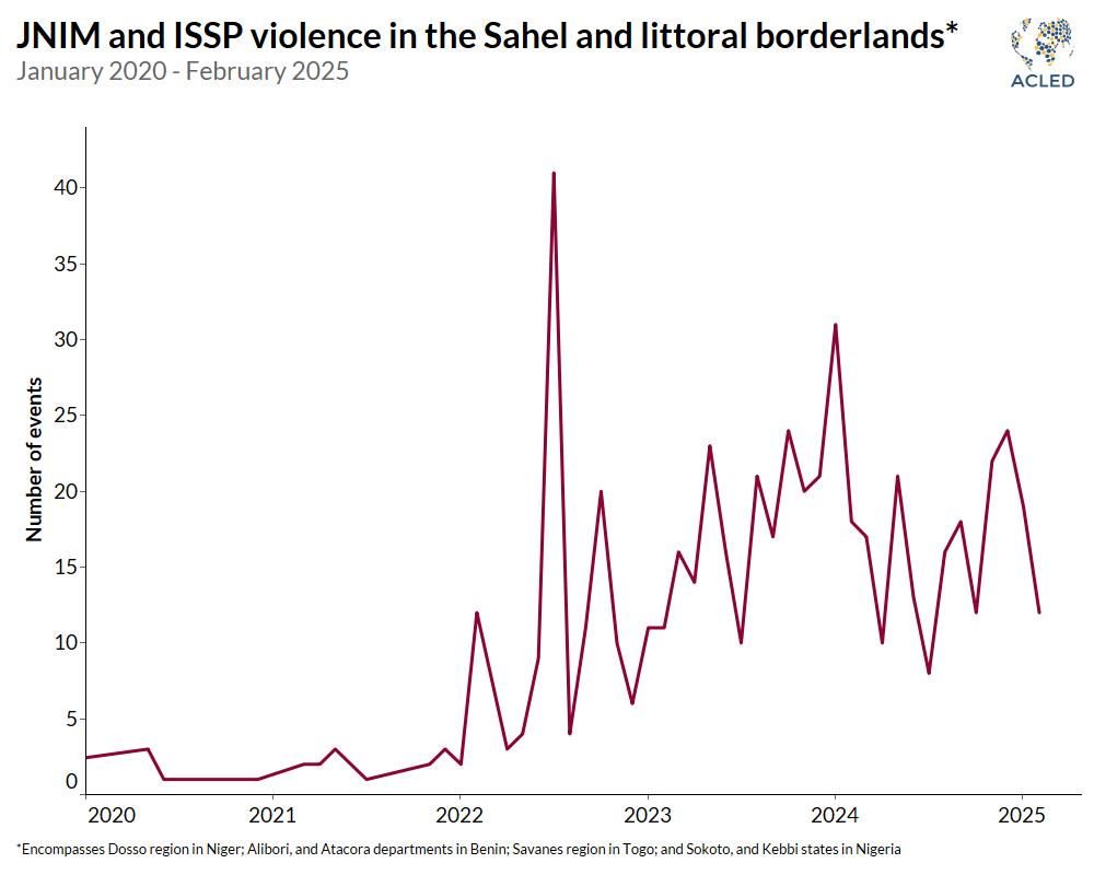 Since early 2024, the violent campaigns of the al-Qaeda-affiliated Jama’at Nusrat al-Islam wal-Muslimin (JNIM) and the Islamic State Sahel Province (ISSP) jihadist groups have been reshaping the security landscape in the Sahel and its littoral borderlands. These groups have significantly expanded their operations, transforming the regions bordering the Sahel toward the coast, often called coastal West Africa or “littoral borderlands,” into an active conflict hotspot. ACLED data show that JNIM and ISSP have entered a new phase of expansion, and their growing influence in the border regions between Niger, Nigeria, and Benin is part of a broader regional trend of jihadist expansion, and consequently, a larger proportion of the civilian population being exposed to conflict.