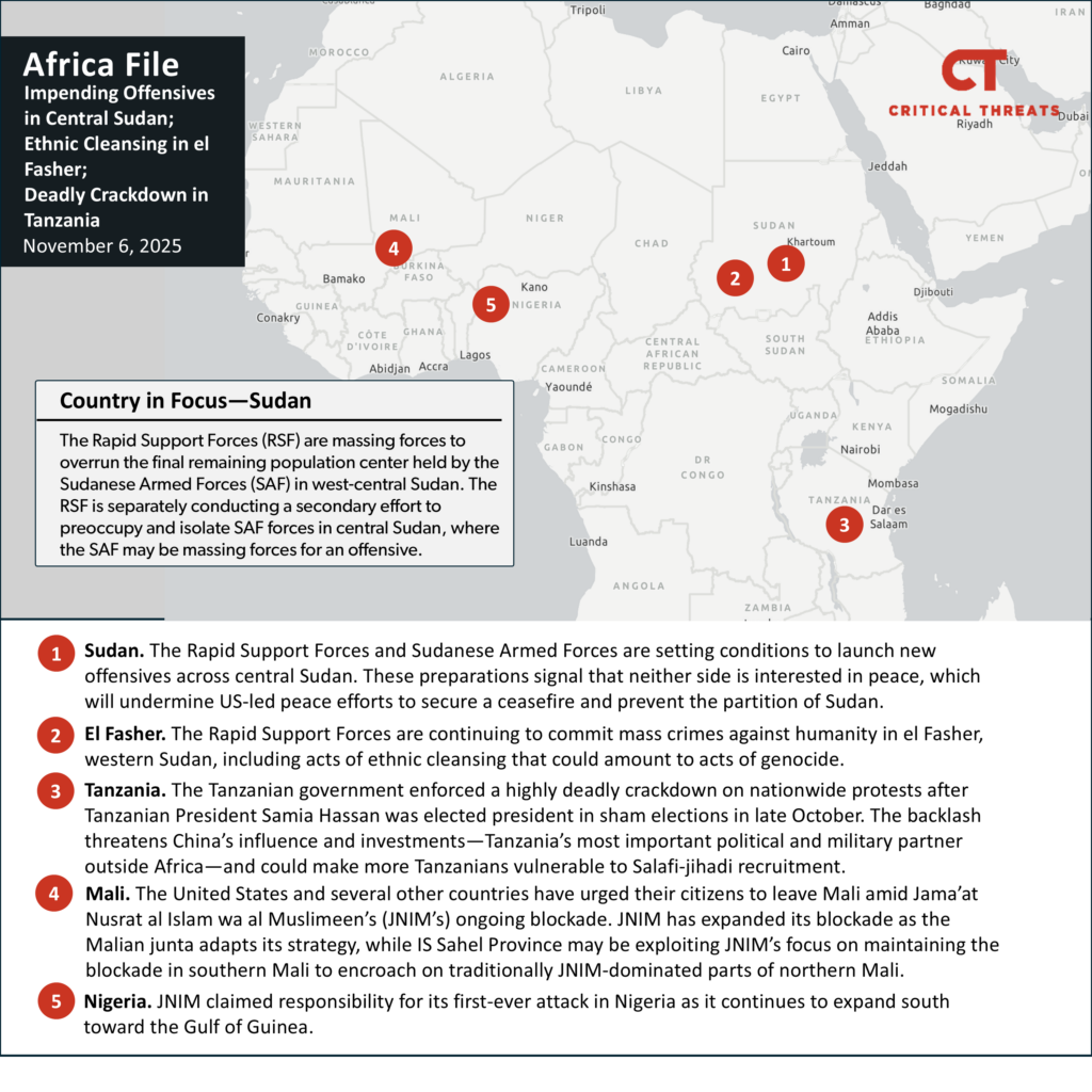 The RSF is continuing efforts to capture the final remaining SAF-aligned pocket in western Sudan, which would complete the RSF’s de facto partition of Sudan. The RSF briefly captured Abu Gomra—located 200 miles northwest of el Fasher—on October 16 before SAF-aligned forces retook the town.[16] The RSF has regrouped in nearby localities and is reportedly positioned to target Abu Gomra and Tina, which is located on Chadian border.[17] The RSF conducted drone strikes on Karnoi—a logistic hub located 65 miles north of Abu Gomra—on November 3.[18] The SAF has responded by conducting supply airdrops to Abu Gomra and Tina and airstrikes on RSF positions.[19] CTP previously assessed that RSF control of el Fasher would enable the group to redeploy resources to other frontlines.[20]