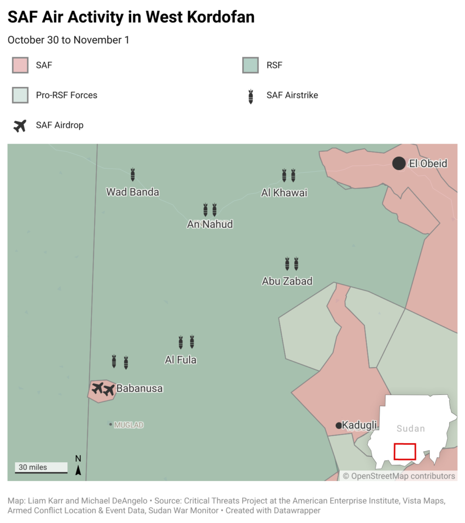 The SAF may be preparing to launch a new westward offensive from el Obeid. The SAF has responded to recent developments by announcing a general mobilization in eastern Sudan, with a local source stating that the SAF is sending senior commanders and troop reinforcements to el Obeid.[12] The SAF has reportedly secured additional military support from Egypt following the RSF’s capture of el Fasher, with Turkey also expected to supply more drones.[13] The SAF has additionally conducted airstrikes on RSF positions north, southwest, and west of el Obeid.[14] The SAF has repeatedly declared its intention to capture RSF-controlled territory in western Sudan.[15]