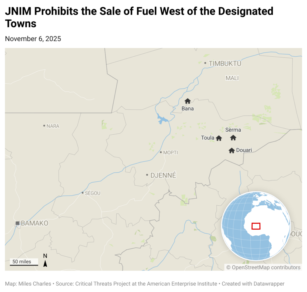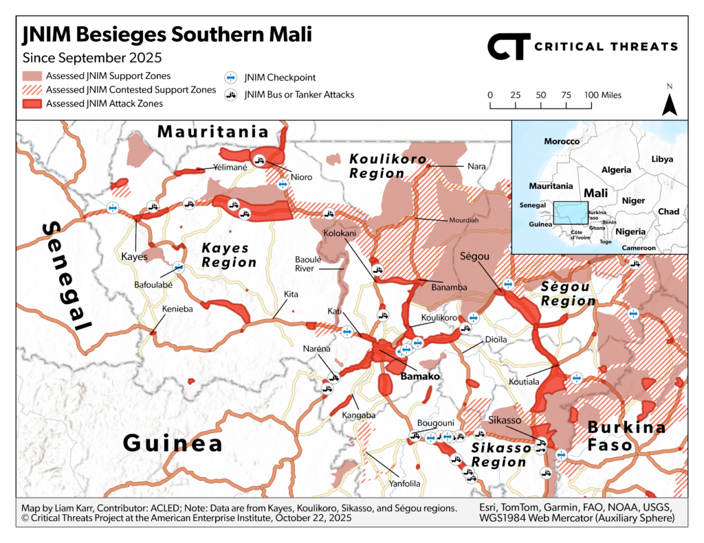 JNIM has expanded its blockade as the Malian junta slowly adapts its security and procurement protocols. JNIM announced on November 2 that it would prevent the sale of fuel west of a designated cordon in central Mali’s Mopti region.[96] A JNIM spokesperson explicitly noted that fuel traders could continue selling east of the cordon and that the measure was aimed at preventing fuel from reaching the Malian army and aligned Dozo militias.[97]